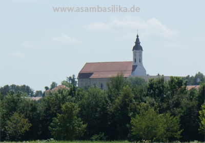 Die Asambasilika liegt am höchsten Punkt des Ortsteils Altenmarkt, weithin sichtbar, doch von außen kündet wenig von der ganzen Pracht im Inneren der Basilika. So nähert man sich entweder von der Nordseite kommend über den Friedhof, oder man wählt den verschlungenen Weg über die Klostergebäude, kreuzt den Innenhof und gelangt so genau gegenüber von der Südseite in das Kirchenschiff. |